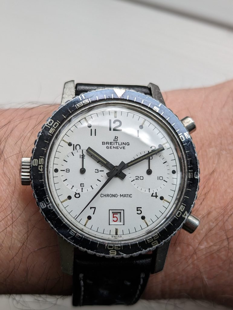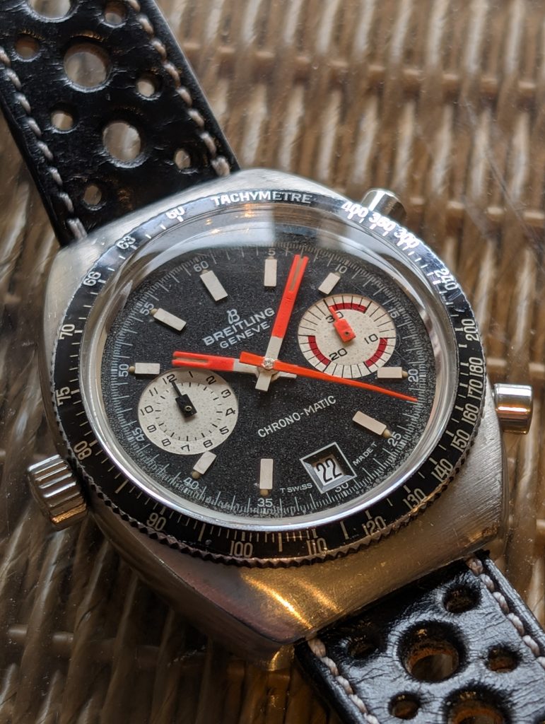 Initially, all 3 makers – Breitling, Hamilton and Heuer – branded their watches “Chrono-matic” but Breitling soon acquired that name. Here’s an example of a mid 1969 Breitling 2114, on a 19mm Geckota leather racing strap: