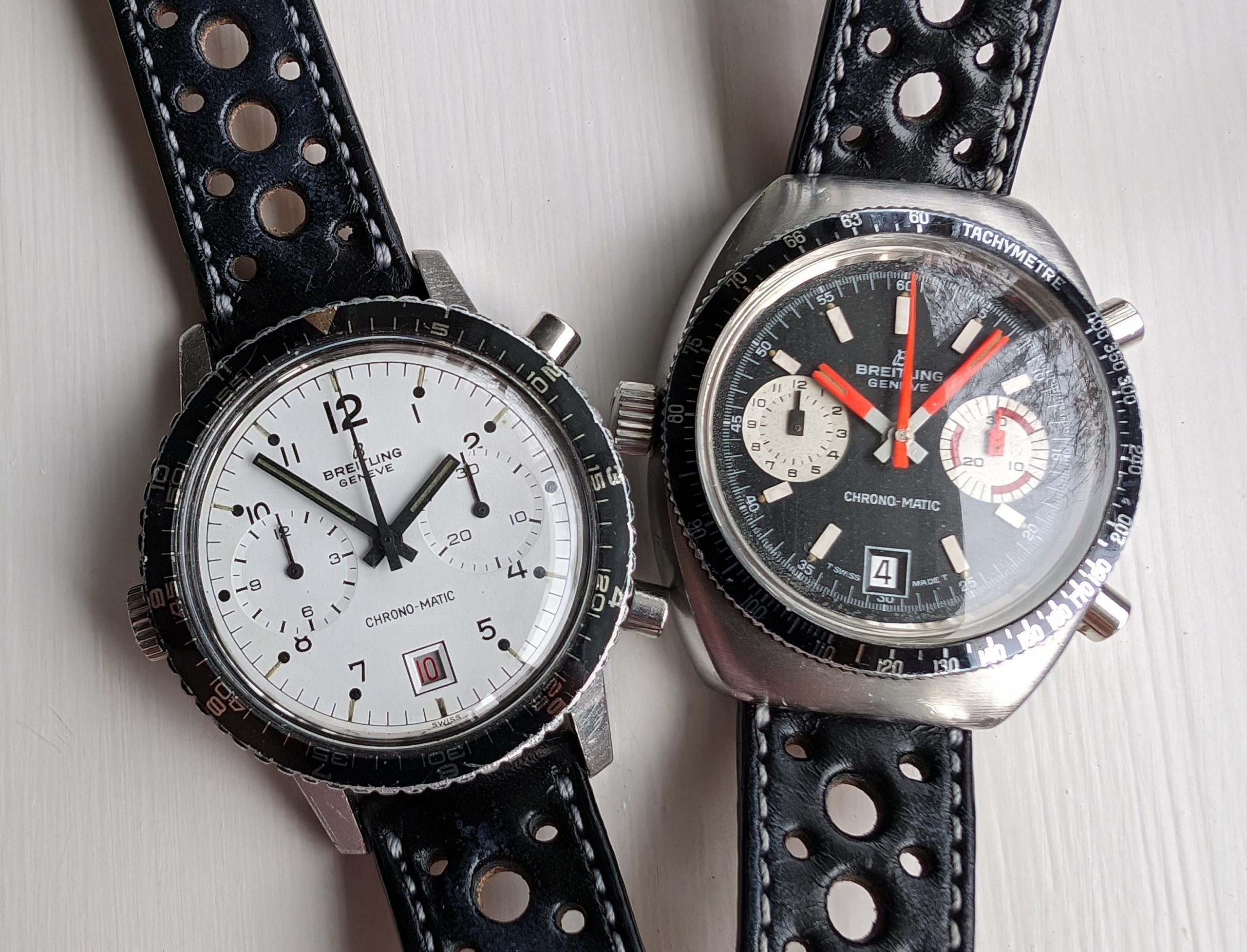 Initially, all 3 makers – Breitling, Hamilton and Heuer – branded their watches “Chrono-matic” but Breitling soon acquired that name. Here’s an example of a mid 1969 Breitling 2114, on a 19mm Geckota leather racing strap: